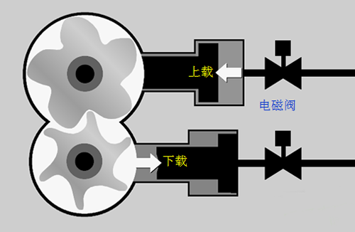 常閉式柱塞式電磁閥的基本結(jié)構(gòu)主要由:殼體、彈簧、銜鐵、電磁線圈、鐵心等元件組成。在正常狀態(tài)下,電磁閥閉合與銜鐵固接成一體的回流孔塞將回流孔口和回流通道封堵。當(dāng)電磁線圈通電后,鐵心產(chǎn)生電磁力使銜鐵連同回流孔塞克服彈簧力而下移,此時(shí)電磁閥開(kāi)啟,回流孔口被打開(kāi),封閉螺槽內(nèi)氣體就由回流通道返回進(jìn)氣腔。 柱塞式調(diào)節(jié)被廣泛應(yīng)用于螺桿式冷水機(jī)組調(diào)節(jié)。下圖為某品牌冷水機(jī)組柱塞式調(diào)節(jié)示意圖。 |