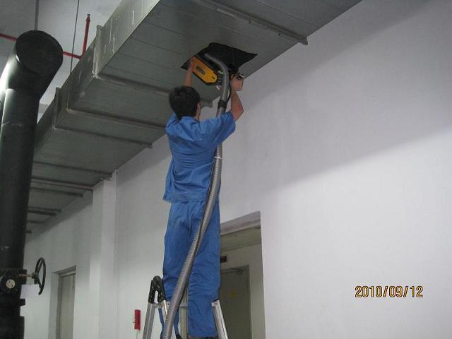 清洗目的 中空調(diào)系統(tǒng)風(fēng)管內(nèi)塵埃堆積,風(fēng)管內(nèi)部的溫濕度環(huán)境促使大量的細(xì)菌、微生物滋生,適宜某些細(xì)菌的生長(zhǎng)和繁殖,形成傳染病源,從而使空調(diào)系統(tǒng)不能提供良好質(zhì)量的空氣。而且風(fēng)管中大量堆積灰塵,會(huì)導(dǎo)致風(fēng)阻加大,增加風(fēng)管系統(tǒng)阻力,使空調(diào)系統(tǒng)的風(fēng)量下降,機(jī)組能力下降,損耗能源。 工藝技術(shù) 了解新風(fēng)管、回風(fēng)管、送風(fēng)管系統(tǒng)的布局,選定吸塵風(fēng)口和清洗風(fēng)口,使用通風(fēng)管監(jiān)視監(jiān)控系統(tǒng)檢查管道內(nèi)污染程度、管道結(jié)構(gòu)內(nèi)特點(diǎn),選擇合適的清洗設(shè)備,阻斷系統(tǒng)放入不清洗的風(fēng)管中一端,以便充分隔離清洗區(qū)和非清洗區(qū),避免二次污染。監(jiān)視系統(tǒng)對(duì)風(fēng)管清洗前、中、后進(jìn)行監(jiān)測(cè)及錄像保存。 風(fēng)管清洗三大方法與基本操作流程 一、機(jī)器人清洗法(適合于鍍鋅鋼板、玻璃鋼、酚醛等非金屬材質(zhì)風(fēng)管) 拆除各種風(fēng)口 → 專業(yè)單位測(cè)定風(fēng)管內(nèi)積塵情況 → 放入檢查機(jī)器人 → 觀察風(fēng)管內(nèi)部情況,確定清洗方案(可制作光盤) → 在需清洗的風(fēng)管二頭放置二個(gè)氣囊并于其中一邊開一個(gè)圓形工藝孔(或利用原有出風(fēng)口),并把該孔與捕集器的吸入口用軟管聯(lián)接 → 再?gòu)牧硪豢趦?nèi)(或利用原有出風(fēng)口)放入清掃機(jī)人邊走邊打松灰塵由捕集器同時(shí)把灰塵吸走即“楊塵吸塵法“(適合中、小型風(fēng)管)。{或先放入清掃機(jī)器人打松積塵 → 然后再放入吸塵機(jī)器人吸走灰塵“直接吸塵法”(適合大、中型風(fēng)管)} → 放入噴霧消毒機(jī)器人噴灑消毒劑 → 放入檢查機(jī)器人觀察風(fēng)管清洗后情況(可制作光盤) → 專業(yè)單位測(cè)定風(fēng)管清洗后情況 → 安裝各種風(fēng)口 → 出具清洗完工報(bào)告。 二、軟軸清洗法(適合于鍍鋅鋼板、玻璃鋼、酚醛等非金屬材質(zhì)風(fēng)管和超級(jí)風(fēng)管) 拆除各種風(fēng)口 →專業(yè)單位測(cè)定風(fēng)管內(nèi)積塵情況 →放入軟軸檢查頭→觀察風(fēng)管內(nèi)部情況,確定清洗方案(可制作光盤)→在需清洗的風(fēng)管二頭放 置二個(gè)氣囊并于其中一邊開一個(gè)圓形工藝孔,并把該孔與捕集器的吸入口用 軟管聯(lián)接 →再在另一邊放入清掃軟軸機(jī)邊推邊打松灰塵由捕集器同時(shí)把 灰塵吸走即“楊塵吸塵法”(或通過和專用高壓吸塵器同時(shí)工作可實(shí)現(xiàn)對(duì)上述風(fēng)管的清洗與吸塵同步完成“直接吸塵法”) →放入噴霧消毒軟軸機(jī)噴灑消毒劑 →放入軟軸檢查頭觀察風(fēng)管清洗后情況(可制作光盤)→專業(yè)單位測(cè)定風(fēng)管清洗后情況 →安裝各種風(fēng)口→出具清洗完工報(bào)告。 三、風(fēng)刀與振動(dòng)鞭清洗法(適合于鍍鋅鋼板、玻璃鋼、酚醛等非金屬材質(zhì)風(fēng)管和超級(jí)風(fēng)管)